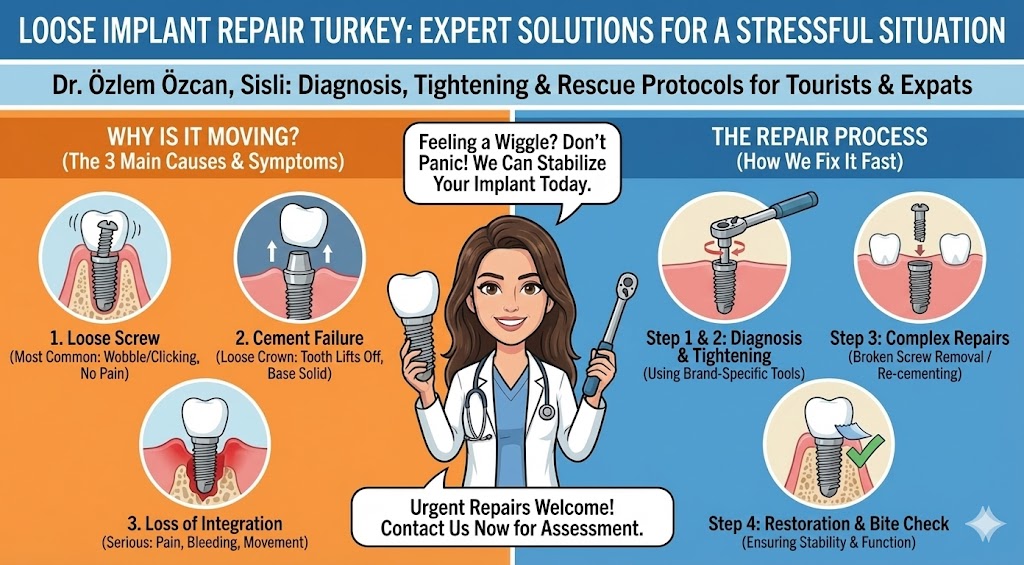 In this reassuring and technical guide, Dt. Özlem Özcan, a leading implantologist in Sisli, explains the causes of a loose implant, how we diagnose the issue, and the advanced repair protocols we use to stabilize your smile immediately.