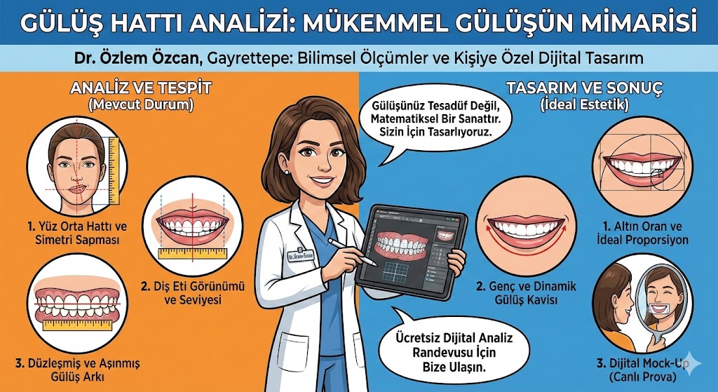 Gülüş Hattı Analizi; yüz hatları, dudak yapısı, diş etleri ve dişlerin birbiriyle olan ilişkisinin dijital ve klinik ortamda değerlendirilmesidir.