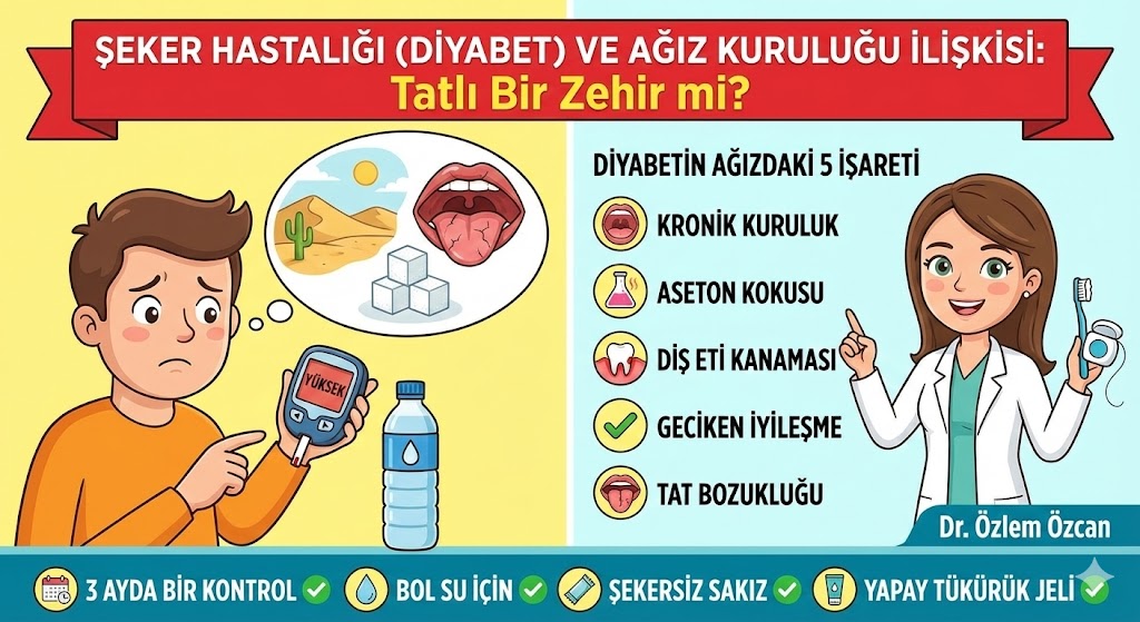 Diyabet, sadece kan şekerinizi değil, vücudunuzdaki tüm sıvı dengesini etkileyen sistemik bir hastalıktır. Ve bu dengeden en çok nasibini alan organlardan biri de ağzımızdır. Diş Hekimi Özlem Özcan olarak, bu kapsamlı rehberde; yüksek kan şekerinin tükürük bezlerine nasıl “sabotaj” düzenlediğini, şeker hastalığı ve ağız kuruluğu arasındaki o güçlü bağı ve diyabet hastalarının dişlerini kaybetmemek için atması gereken adımları tıbbi gerçeklerle anlatıyoruz.