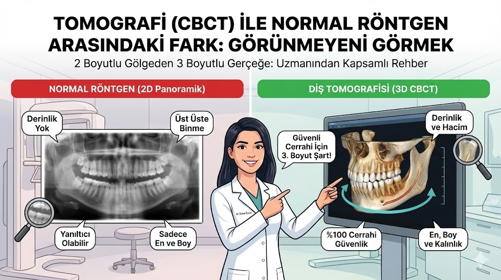 Bu kapsamlı rehberde, Şişli Diş Hekimi Dt. Özlem Özcan olarak, normal röntgenin neden bazen yetersiz kaldığını, 3 boyutlu tomografinin (CBCT) cerrahi riskleri nasıl ortadan kaldırdığını ve bu iki teknoloji arasındaki hayati farkları en anlaşılır haliyle masaya yatırıyoruz.