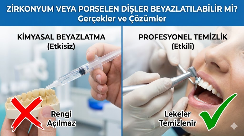 Özetle; zirkonyum veya porselen dişler beyazlatılabilir mi sorusunun cevabı kimyasal olarak “Hayır”, mekanik temizlik olarak “Evet”tir. Kaplamalarınızın ilk günkü ışıltısını korumak, doğru ağız bakımı ve düzenli hekim ziyaretleri ile mümkündür.